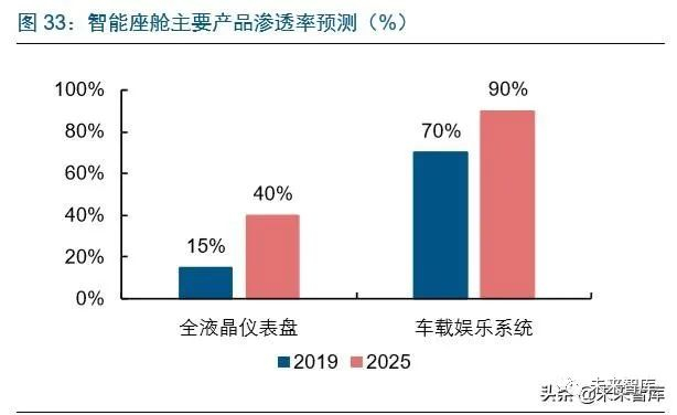 仪表从机械向液晶转变,以及车载娱乐系统智能化和大屏化提升,预计液晶仪表和车载 娱乐系统未来 5 年分别能达到 118 亿和 445 亿的市场规模。1)液晶仪表:仪表盘有望 逐渐由机械仪表向全液晶仪表升级,目前全液晶仪表渗透率约 15%,预计到 2025 年有 望提升至 40%,当前市场价 1500 元,假设到 2025 年市场价下降至 1200 元,可测算 得 2025 年全液晶仪表市场规模有望达到 119 亿元,相比目前规模增长 147%;2)车载 娱乐系统:渗透率将继续提升,且伴随车载大屏化和智能化,单车价值进一步向上,目 前车载娱乐系统渗透率约 70%,单价 1500 元,假设 2025 年渗透率提升至 90%,单价 提升至 2000 元,可测算得 2025 年车载娱乐系统市场规模有望达 445 亿元,相比目前 规模增长 98%。