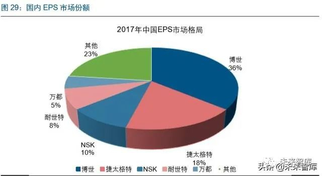 国际零部件厂商占据国内大部分市场,格局已较为稳定。根据 2017 年数据,国内 EPS 市场仍主要被国际零部件大厂占据,其中博世华域转向、捷太格特、NSK 合计市场份额 超过 60%。EPS 行业相对成熟,整个格局较为稳定,龙头厂商博世华域转向、耐世特等有望受益EPS进一步渗透保持稳健增长。中国自主EPS品牌也在寻求突破,易力达、 恒隆、中汽系统、豫北等企业已有 EPS 产品销售,但规模仍然较小。