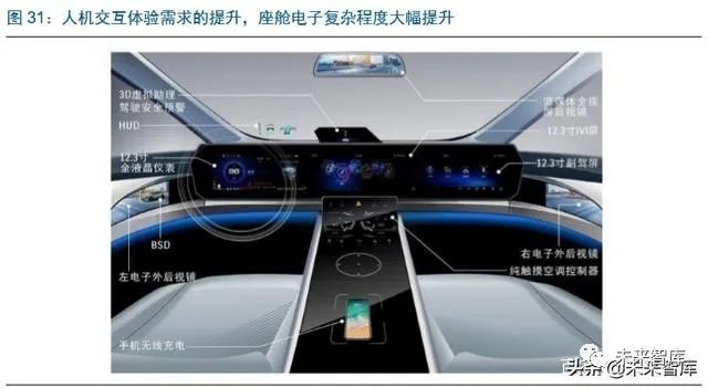 更高的人机交互体验需求带来座舱电子产品品类不断扩容。座舱电子一方面对驾驶员有 很好的科技感体验观感,包括更多的娱乐体验和更直观的信息显示,另一方面,在智能 化提升下座舱电子与驾驶员之间的交互也变得越来越充分,从简单的各类感知信息的提 供到自动驾驶人车之间的切换,这带来座舱电子的功能和复杂度持续的提升。座舱电子 的产品品类也从最初简单的车载娱乐系统扩展到更大屏幕的车载信息系统,数字仪表、 HUD 以等多类产品。