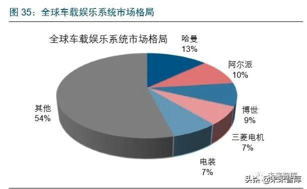 车载娱乐系统格局相对分散,国内企业已有可观份额,仪表作为安全件,格局较为集中。 全球车载娱乐系统来看市场相对分散,巨头的份额一般在 8%-10%左右,代表的企业包 括哈曼、阿尔派、博世、三菱电机、电装等。液晶仪表市场均由外资巨头主导,格局更 为集中,以大陆、日本精机、电装为代表的五大巨头合计份额达到 80%。车载娱乐系统 方面,以德赛西威、华阳集团、航盛电子为代表的本土企业逐渐崛起,在高性价比优势 下市场份额有所提升,德赛西威市占率已经超过 20%;仪表方面,德赛西威、航盛电子 等仍然定位于中低端车型,高端车型仍被国际巨头垄断。