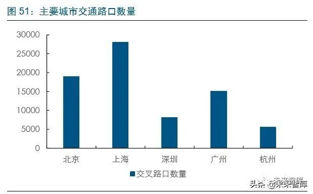 基建端覆盖是 V2X 实现的基础,重点城市交叉路口以及高速公路将是 RSU的主要覆盖 点。根据美国的经验以及 V2X的主要作用,第一是改善城市区域交通状况,第二是高速 公路以及重要公路的安装。目前国内以北京、上海、广州、深圳和杭州为例交通路口的 数量大致为 5000 个-30000 个左右,平均基本在 8000 个以上。全国二级以上公路里程 数约为 64.78 万公里,其中高速公路数量为 14.3 万公里。