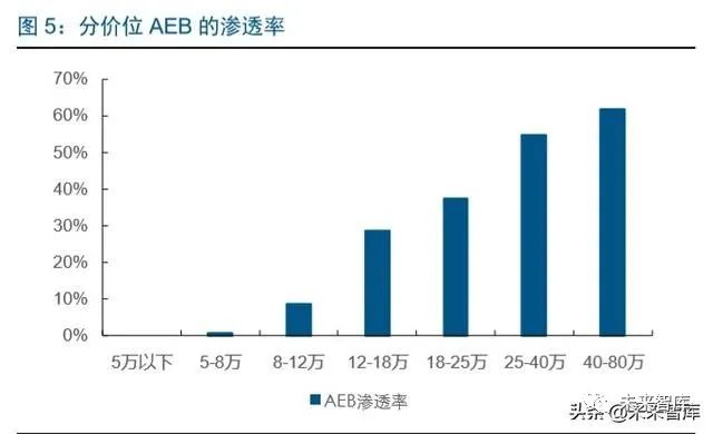 目前 L2 辅助驾驶主要集中在中高端车型上,中低端车型仍然有巨大的渗透潜力。分价 格来看,以 AEB 为例,18 万以上的装配率已经超过 40%,但是 15 万以下,尤其 12 万 以下的装配率不足 10%。15 万以下车型销量在 2019 年仍然占比超过 60%以上,中低 价格车型辅助驾驶具有很大的渗透空间。