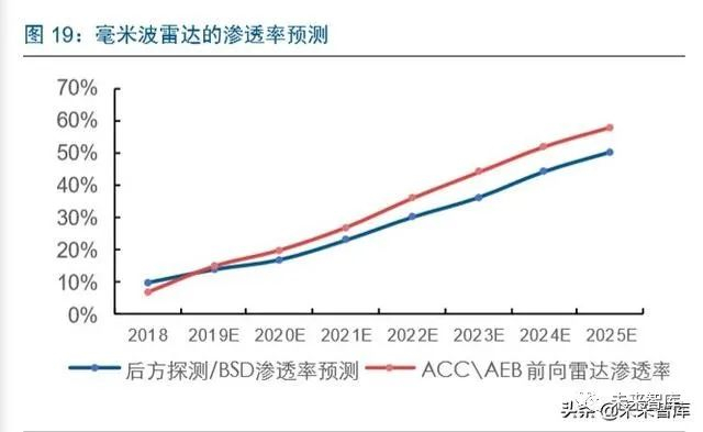 随着 L2 级智能驾驶需求的提升,由于毫米波雷达穿透能力强,需求进入爆发增长期, 市场规模有望从目前 43 亿提升到 189 亿。毫米波雷达的快速渗透除了本身汽车智能化 的整体需求,AEB 作为 C-NCAP 的 5 星评价标准将进一步提升 AEB 的渗透率,预计 2025 年渗透率将从目前 15%左右提升到 50%以上。目前的毫米波雷达 24Ghz 主要作 为后向雷达为主,两颗的单车价值约为 600-800 元,77Ghz 毫米波雷达主要用于前向雷达,预计单车价值约 700-1000 元,预计市场空间从 2019 年的 43 亿提升到 2025 年 的 189 亿元,复合增速达到 27.7%。