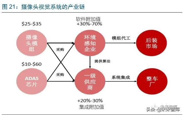 摄像头视觉系统的核心是软件算法,芯片以及算法的附加值较高。摄像头与毫米波雷达 虽同是传感器,但核心技术上却有较大差异。毫米波雷达主要在射频芯片以及天线设计 等对波的处理,摄像头背后的算法和芯片才是核心,而摄像头模组本身的壁垒并没有很 高。一般而言,由从事环境感知的企业采购摄像头模组以及 ADAS 芯片,在芯片上实现 算法软件的开发,软件的附加值可以达到 30%-70%以上的增幅。相对于摄像头模组, 芯片与软件的附加值更高,这也是 Mobileye 能异军突起的核心原因。目前 Mobileye 凭 借领先同类产品较多的算法能力,市占率保持在 80%以上。
