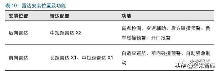 毫米波雷达具备穿透恶劣天气的特性,是智能驾驶传感器重要的保障,单车用量在 3 颗 以上。采用雷达向周围发射无线电,通过测定和分析反射波以计算障碍物的距离、方向 和大小。毫米波的波长特性方便毫米波雷达能不受天气影响,同时能直接测量距离和速 度信息的特点使得毫米波雷达应用于自适应巡航、碰撞自动刹车上有着天然的优势,也 是目前自适应巡航主流的传感器解决方案。目前来看, L3 级智能汽车毫米波雷达应用或 超过 5 颗。