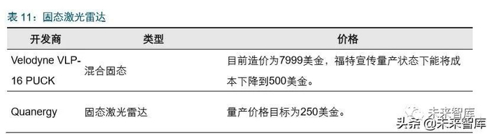 激光雷达通过构建附近环境的建模,可以大幅提高安全性,同时对算法的依赖相对较低, 目前 L3 以上的自动驾驶汽车中使用较为频繁,固态激光雷达推出有望有效降低成本。 激光雷达可以构建附近环境信息,对路牙、一些难识别的物品有非常好的识别效果,行 人识别上对算法的要求也远低于视觉系统。激光雷达构建的图像和高精地图比对还可以 实现定位的作用。目前激光雷达成本较高,但固态雷达量产或能大幅降低成本。“固态” 概念可以称为基于电子部件,无机械旋转部件的解决方案。基于置于车顶的 360 度机械 旋转激光雷达实现。它的性能非常好,但是相应的也具有成本过高,体积大、外部可见 等劣势。“固态”激光雷达产品则由于采用电子方案去除了机械旋转部件,因此具有低成 本(几百美元级别)和体积小、可集成至传统车辆外观中的特点。