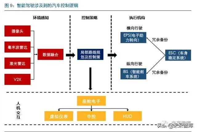 从基础结构来看,单车智能主要通过传感器、控制器、执行器以及人机交互的配合实现, 功能也同时对应着相应产业链,汽车智能化的快速渗透有望带来产业链的巨大机会。单 车智能实现主要方式是以摄像头、毫米波雷达、激光雷达等传感器感知环境,再通过控制器(处理器)对数据进行分析,最终在电子刹车、电子转向以及动力总成等介入,实 现纵向和横向的控制。执行机构中主流的产品为 ESC(车身稳定系统),未来将逐步采 用 IBS(智能刹车系统)作为主要执行机构。人机交互在汽车智能化持续提升下也变得 越来越重要,包括驾驶车对综合信息的掌控以及人车行驶切换的提醒等,人机交互也就 是座舱电子,主要产品包括中控、仪表和 HUD 等。