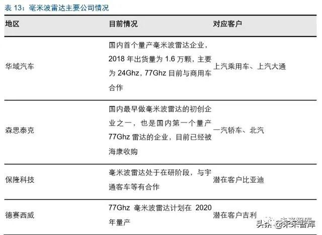 毫米波雷达领域国内企业已有产品量产,华域汽车、森思泰克是国内较为领先的公司, 未来的竞争力主要来自于 77Ghz 产品推出的速度和对应的规模体量。目前国内企业中 华域汽车是国内首个量产毫米波雷达企业,2018 年出货量为 1.6 万颗,主要为 24Ghz, 77Ghz 目前与商用车企业合作。森思泰克作为国内最早做毫米波雷达的初创企业之一, 也是国内第一个量产 77Ghz 雷达的企业。其他包括保隆科技、德赛西威等均有毫米波 雷达技术储备,并与主机厂加大合作。