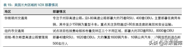 怀俄明州、纽约、佛罗里达州是美国重点试验区域,针对商用车、人车混流以及高速公 路等多个场景进行测试。美国在 2015 年 9 月开始启动怀俄明州、纽约、佛罗里达州 Tampa 三地的 DSRC 试点示范工作。2016 年 12 月完成第一阶段概念设计。2018 年 5 月完成第二阶段设计/建造/测试。目前进入第三阶段运营和维护验证。怀俄明州交通局 目前部署大约 75 套 RSU 和 4000 套 OBU,主要面向商用车给予高速公路路况、恶劣 天气报道等信息提供;纽约交通局目前部署超过 353 套 RSU 以及 8000 套 OBU, 主要解决人车混流的环境,尤其是给行人配备设备,提供语音警报;坦帕-希尔斯堡高速公路 管理局部署 40 套 RSU 和 1620 套 OBU,主要针对高峰时间交通拥堵的问题。
