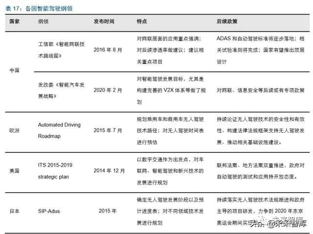 发改委发布《智能汽车发展战略》,从顶层规划智能汽车未来发展,网联智能的基础建 设是其中的重点。2020 年 2 月,发改委发布《智能汽车发展战略》,针对加快汽车行业 智能网联创新发展的推进,在战略方向、总体要求、主要任务、保障措施等给出了纲领 性的意见。核心内容包括构建系统开放的智能汽车技术创新体系、构建先进完备的智能 汽车基础设施体系、构建全面高效的智能汽车网络安全体系等。全球其他国家也均有类 似方案,在大的纲领性文件落地后,后续专项政策有望陆续出台。