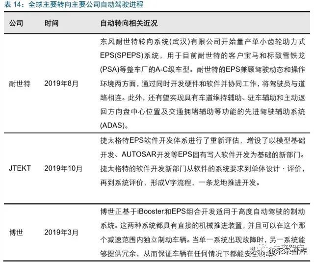 注 EPS 设计初衷为方便驾驶员转向,而自动驾驶的出现使得 EPS 作用大幅提升,肩负着 自动转向功能。在上世纪 90 年代就问世,其设计初衷主要为了便于驾驶车用更轻便的 实现汽车的转向操作。但目前随着自动驾驶的引入,未来自动转向等横向操作的核心执 行机构将由 EPS 完成,这让具备 EPS 企业将大幅参与到整车厂的自动驾驶开发中。