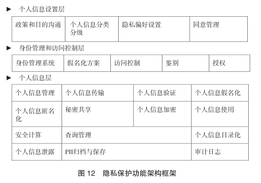 ④系统隐私功能模块设计。对于包含家族信托客户数据的业务系统应建立隐私保护功能架构的主要组件。该参考架构分成三层:个人信息设置层、身份和访问管理层、个人信息层。