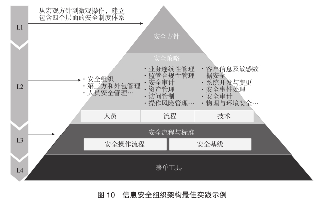 国家信息安全有关监管规定明确要求设置信息安全专门管理机构,设立信息安全管理岗位,对于信息安全职责要清晰定义。成熟的信息安全组织架构包括决策机构、管理机构、执行机构和监督机构四个部分: