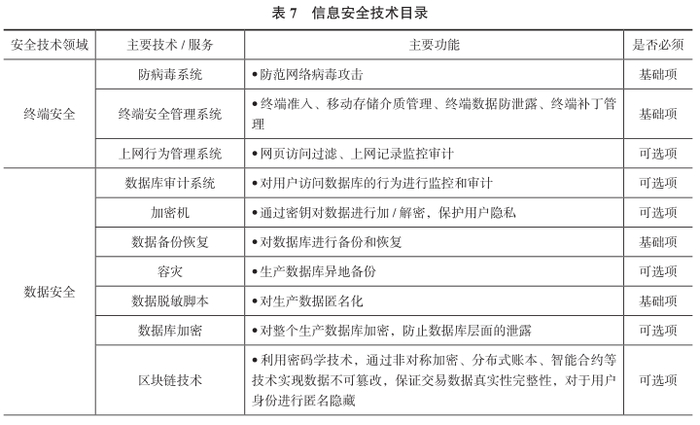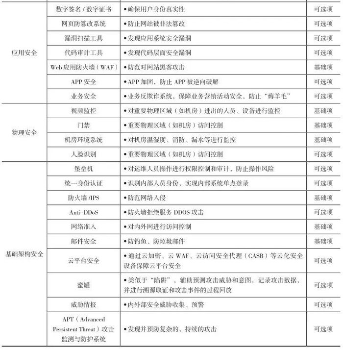 各信托公司应结合自身预算、等级保护合规要求设计适当的信息安全技术架构。以下列示了常见的安全技术平台,其中“必要性”栏目包括“基础项”“可选项”两类建议,“基础项”表明对于所有公司最基本的安全技术手段,“可选项”表明对防护要求更高的安全技术手段。