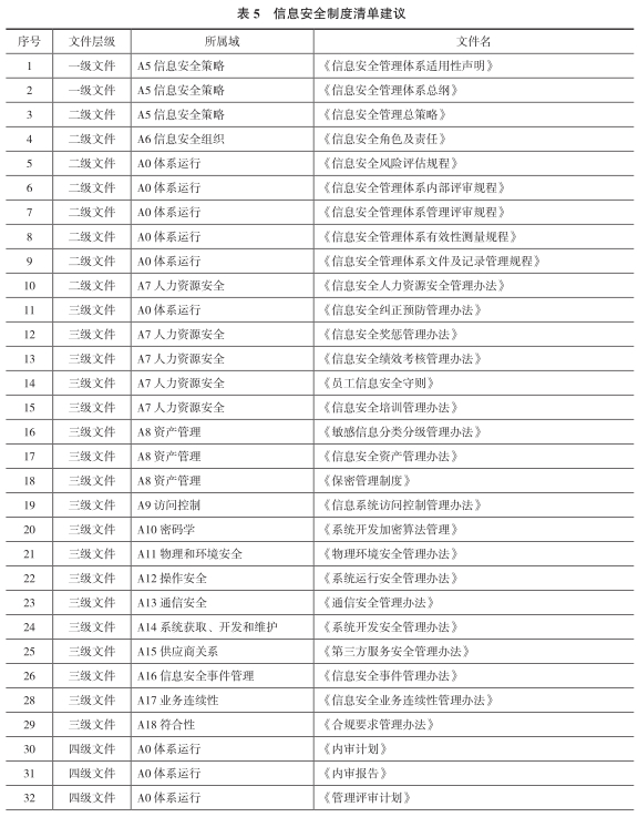 信托公司应结合国家及信息安全监管部门最新要求和自身业务需求,建立信息安全方针、制度、策略,形成完整的安全制度体系,明确信息化建设整个生命周期过程中的安全要求,确保信息安全工作有法可依、有章可循。具体可参照信息安全管理体系标准(ISO 27001),信托公司应从总体策略、管理制度、操作规程、操作记录四个方面进行制度体系设计,可参照表 5。