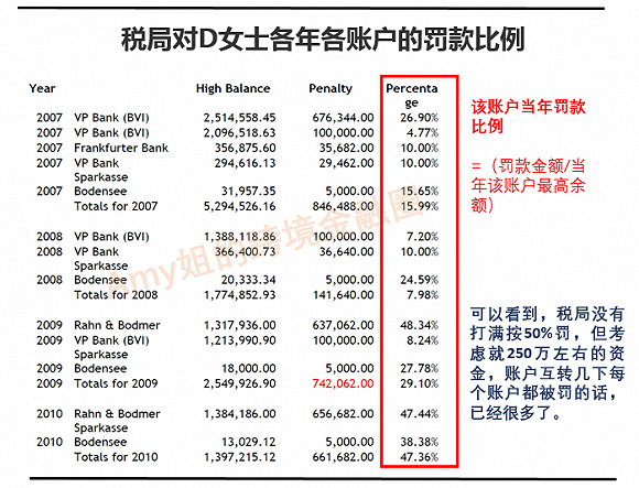 下面这张罚款单,曝光了美国人D女士隐瞒海外银行账户资产的处罚情况。