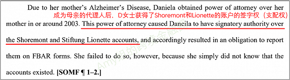 对D女士“并不拥有账户说”,税局认为,D女士虽然不直接拥有离岸信托下几个实体账户,但其母亲作为信托的唯一受益人(拥有账户签字权),在D女士2003年其成为其母亲的代理人之后,便获得了账户的签字权(支配权)。