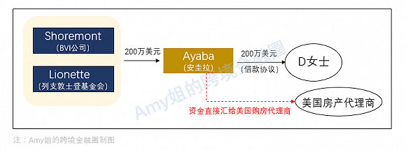 2007年,为购买一处物业,D女士从信托中借款约200万美元,这200万美元资金,D女士“谨慎地”并未过手,而是(在2008年)由受托人通过新设的安圭拉公司Ayaba(有两个银行账户,分别在瑞士和BVI),直接打给了D女士购买物业的代理商。