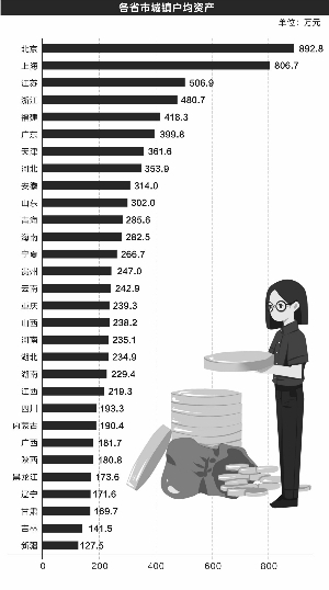 分省份看,家庭资产最高的三个省(自治区、直辖市)为北京、上海和江苏,分别达到892.8万元、806.7万元和506.9万元。最低的三个省(自治区、直辖市)为新疆、吉林和甘肃。