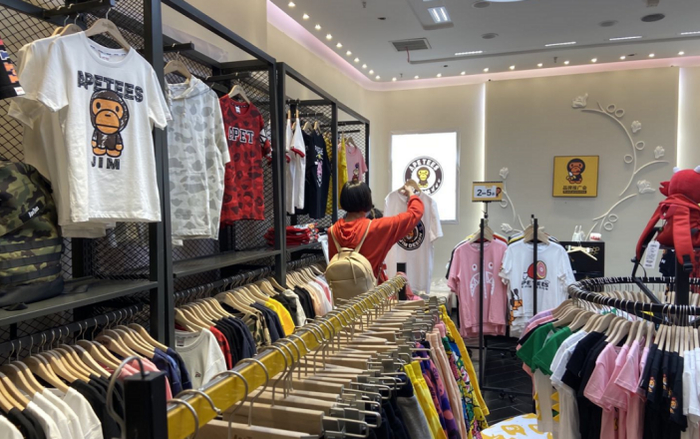 然而,记者在实地走访中发现,安逸猿(Ape Tees)还在营业的店铺里,仍在售卖侵权的商品,款式种类甚多,店内还有络绎不绝的顾客。“我们新上了一批货,现在打4折或者5折。”店员向消费者介绍道。