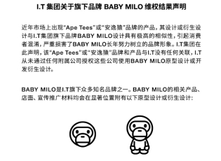 近日,I.T集团发声明称,市场上出现的“Ape Tees”或“安逸猿”品牌,其品牌Logo、产品设计、店面装修及陈列与 Baby Milo都十分相似;但I.T 集团从未直接或间接授权这些公司使用Baby Milo原型设计或开发衍生设计。一时间,引发粉丝密切关注,不少人表示,“支持维权,打击山寨”。
