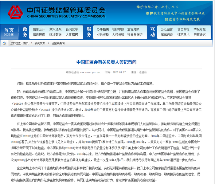 4月27日晚间,证监会对瑞幸造假相关问题给出最新回应。证监会表示,自瑞幸咖啡自曝财务造假以来,证监会第一时间对外表明严正立场,并就跨境监管合作事宜与美国证监会沟通,美国证监会作出了积极回应。中国证监会一向对跨境监管合作持积极态度,支持境外证券监管机构查处其辖区内上市公司财务造假行为。