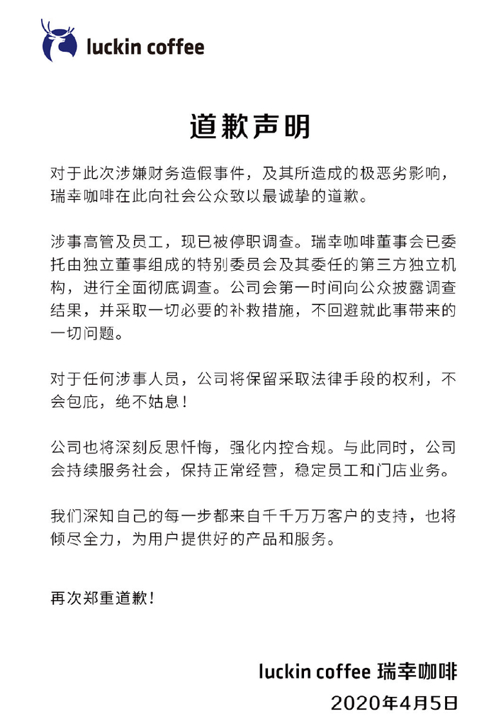 在自曝造假当日,瑞幸股价开盘暴跌逾80%,并触发熔断暂停交易,市值瞬间蒸发300亿,令大量投资者损失惨重。4月5日,瑞幸官方发布道歉声明,称涉事高管及员工已被停职调查,将在第一时间公布调查结果,并采取一切必要的补救措施。
