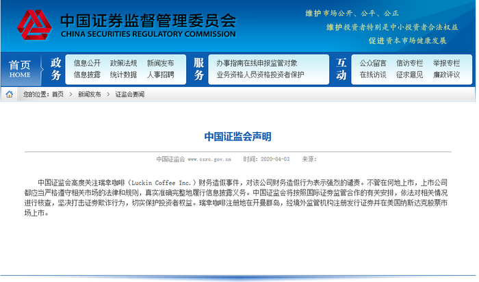 4月3日,证监会官网挂出声明称,证监会高度关注瑞幸咖啡(Luckin Coffee Inc.)财务造假事件,对该公司财务造假行为表示强烈的谴责。不管在何地上市,上市公司都应当严格遵守相关市场的法律和规则,真实准确完整地履行信息披露义务。