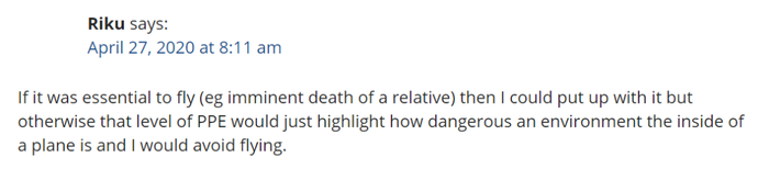 也有人认为,除非家人去世等原因,他宁可暂缓坐飞机出行,因为空乘人员的防护级别已经显示了机舱内的环境有多可怕。