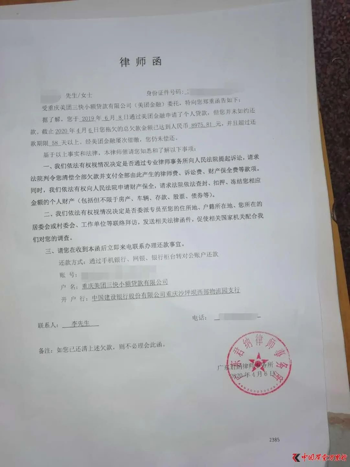 一开始朱先生以为美团金融这块因疫情原因协调不到位,也没有当回事儿,可在4月8日他把延期的贷款归还了之后,4.月11日,催收公司在电话对他辱骂让他还款,紧接着在4月12日,朱先生家人收到一家名为广东君纳律师事务所的催收函。