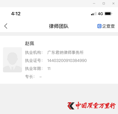 经企查查查询,广东君纳律师事务所注册于2016年6月2日,其法定代表人是赵佩,在其经营的范围内也只查到了赵律师一个人的注册记录和执业证号码。
