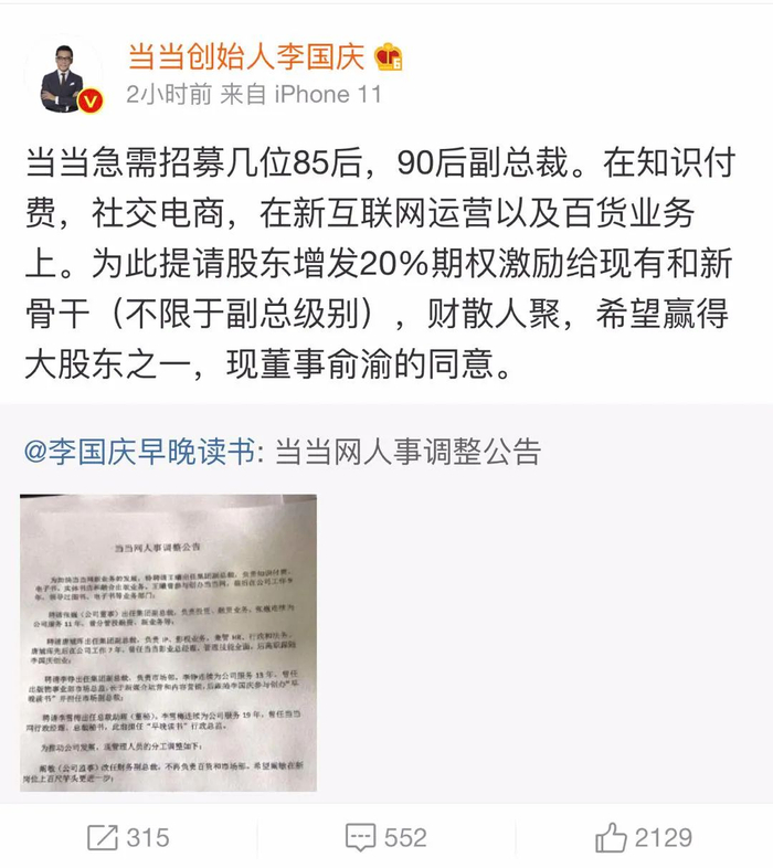 继去年10月“第一季 摔杯”——“李国庆摔杯一怒指控俞渝导演‘八王逼宫’,俞渝深夜大爆料怒撕李国庆”之大型离婚撕逼闹剧之后,“第二季抢公章”也是高潮迭起,剧情的节奏感掌握得特别“好”,4月26日晚间他爆出与儿子的聊天记录;4月27日中午他在微博和微信朋友圈上说明事件的前因后果;4月28日他发布当当人事调整公告,包括让俞渝负责当当公益基金等等……盖了章!