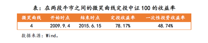 当然中证100的微笑曲线不仅以上时间段,如果单从微笑曲线的角度考虑,在从2009年牛市高点定投至2015年牛市高点,在这样一个较大跨度的微笑曲线来定投中证100,收益率也是相当不错的。