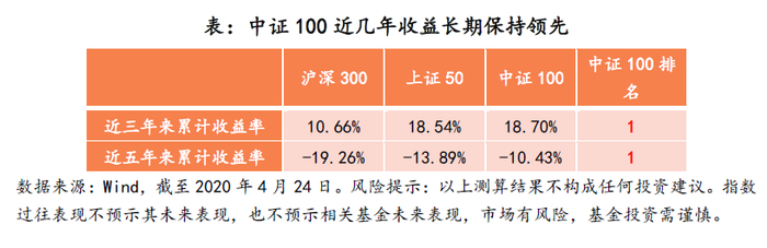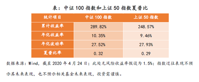 自成立以来(2005年底)截至2020年4月24日,中证100指数累计收益率为289.82%,年化收益率达到10.35%,领先同期上证50指数;年化波动率为27.52%,夏普比为0.32,是A股中表现相对稳定的指数之一。