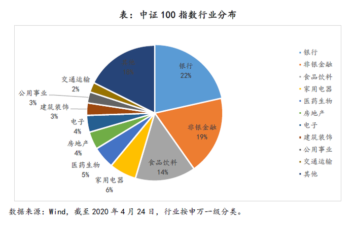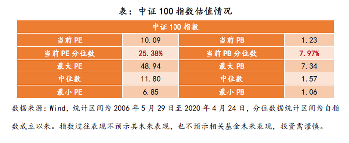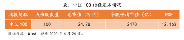 截至2020年4月24日,中证100指数总市值约24.78万亿,个股平均市值约2478亿,总体呈现大盘价值的特征。