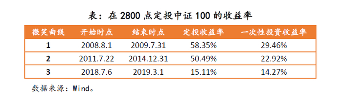 下面,我们用中证100指数在这三个2800点附近的数据进行了测算,结果显示,2800点附近定投中证100经过微笑曲线后都取得了不错的收益。