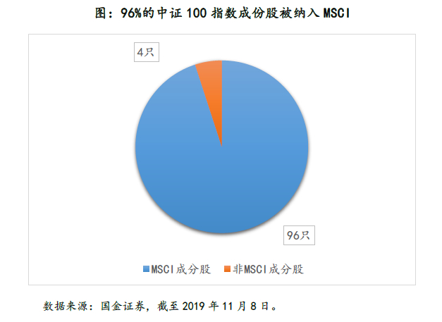 2019年11月MSCI中A股的纳入因子提升至20%。目前纳入标的以大市值蓝筹股为主,其中中证100指数成份股共有96只入选。