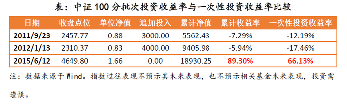 自2011年7月22日开始进行分批次投资,总计投入10000元,分别在同年9月23日和2012年1月13日进行第二批和第三批买入,在2015年6月12日止盈,分批次投资累计收益率达到89.30%,同时间段一次性投资收益率达到66.13%,年化收益率分别为17.20%和13.46%。