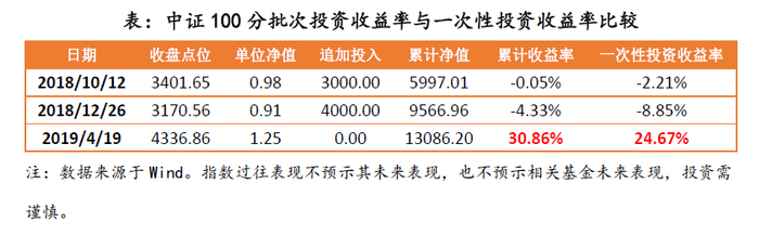由于2018至2019年中证100的微笑曲线幅度没有历史那么大,合理调整投资下跌标准,这里设置为4%。自2018年7月2日开始进行分批次投资,分别在同年10月12日和12月26日进行第二批和第三批买入,在2019年4月19日止盈,分批次投资累计收益率达到30.86%,同时间段一次性投资收益率达到24.67%,年化收益率分别为40.93%和32.48%。
