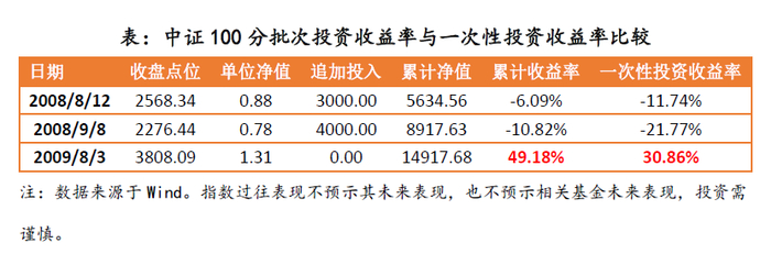 自2008年8月1日开始进行分批次投资,总计投入10000元,分别在同年8月12日和9月3日进行第二批和第三批买入,在2009年8月3日止盈,投资时间一年,分批次投资累计收益率达到49.18%,同时间段一次性投资收益率达到30.86%。