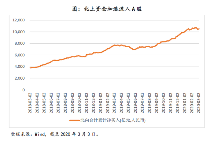 自2014年沪港通开通以及2016年深港通开通以来,外资通过陆股通通道流入A股资金逐年提升。截至2020年3月3日,陆股通累计净流入金额达到1.05万亿元,可以看到外资对于A股的影响越来越大。