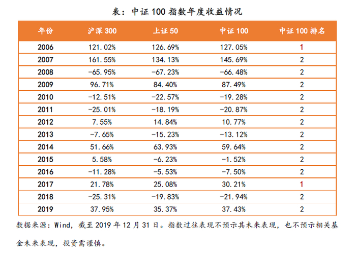 总体而言,历年来中证100指数的收益率介于沪深300和上证50之间,其表现从未同时差于二者;值得注意的是,2006年和2017年,中证100指数收益同时跑赢沪深300和上证50。