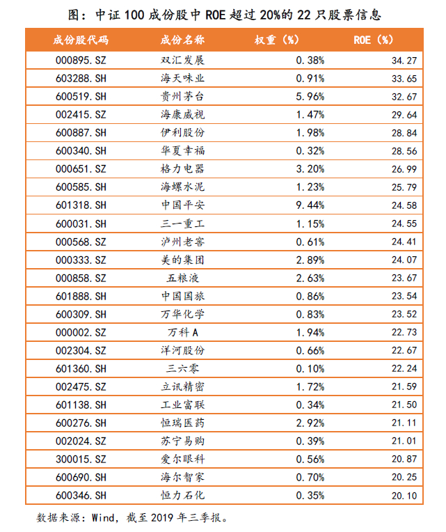 中证100指数ROE达到12.16%,2019年三季报的数据显示其成份股中25只股票ROE超过20%,且该部分股票累计权重达到44%