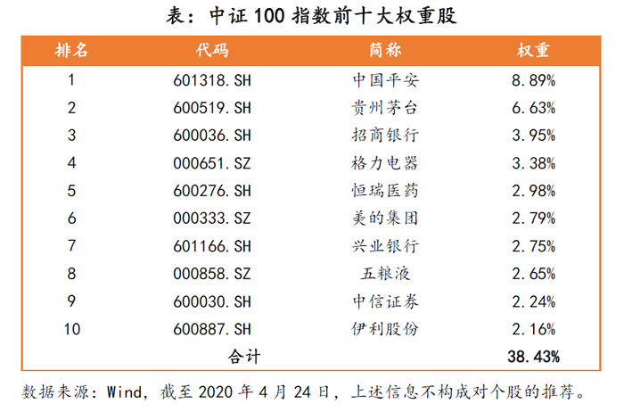 中证100指数行业以金融为主,前五大细分行业分别为银行、非银金融、食品饮料、家用电器以及医药生物,指数所囊括的行业较广泛,且相对平均。同时,中证100指数成份股贵州茅台、招商银行、格力电器、恒瑞医药、中信证券、伊利股份等均为各领域龙头企业,具有明显的“核心资产”的特征。