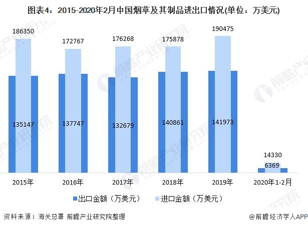 关于烟草进出口情况,据海关总署,2015-2019年,我国烟草及其制品的进出口贸易额较为稳定,呈贸易逆差状态。2019年,我国烟草及其制品进出口贸易总额为33.24亿美元。其中,出口贸易金额为14.20亿美元,进口贸易金额为19.05亿美元,贸易逆差扩大为4.85亿美元。2020年1-2月,我国烟草及其制品出口贸易金额为6369万美元,同比下降41.1%;进口贸易金额为1.43亿美元,同比下降66.1%。