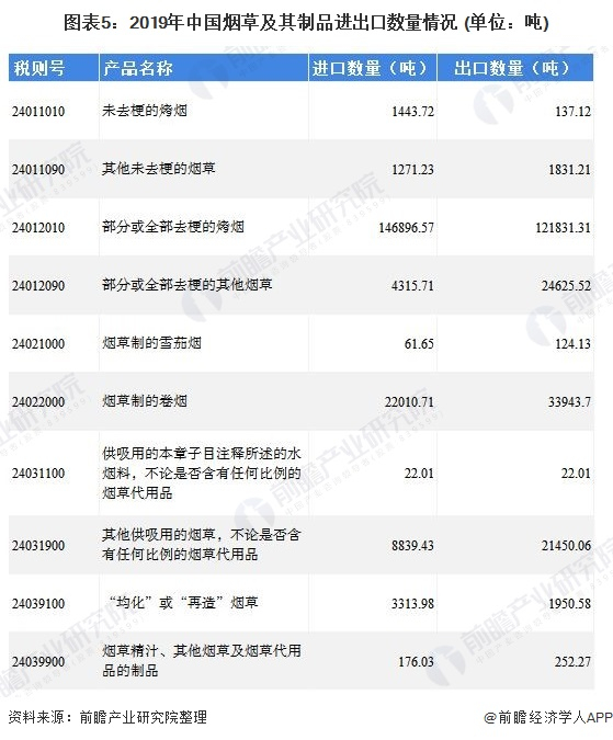 烟草进出口数量方面,2019年,我国烟草及其制品的进口数量共计18.84万吨,出口数量共计25.19万吨。其中,“部分或全部去梗的烤烟”(税则号:24012010)产品的进口数量为14.69万吨,出口数量为12.18万吨;其次是“烟草制的卷烟”(税则号:24022000)产品,进口数量为2.2万吨,出口数量为3.39万吨。