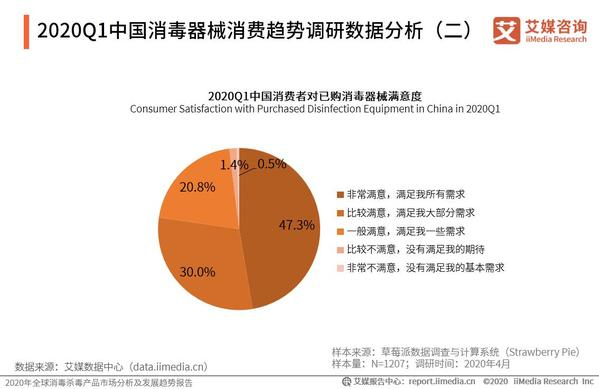 iiMedia Research(艾媒咨询)数据显示,2020年中国大部分消费者对已购买的消毒器械满意度较高,47.3%的消费者对购买的消毒器械非常满意,30.0%的消费者对购买的消毒器械比较满意,20.8%的消费者一般满意,而仅有1.9%的消费者对购买的消毒器械比较或非常不满意。