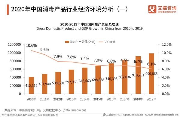 数据显示,2010-2019年中国经济运行平稳,发展质量稳步提升,2019年中国国内生产总值达到990865亿元,同比增长6.1%。艾媒咨询分析师认为,经济的稳定增长使得国家整体卫生健康意识和卫生健康水平提高,为我国消毒产品的发展提供了良好的经济环境。