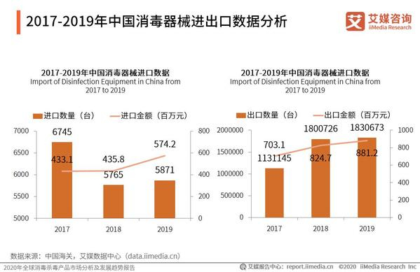 数据显示,2017-2019年中国的消毒器械出口总量高速增长,进口总量有所减少,2019年中国进口消毒器械5871台,进口总额为574.2百万元,出口消毒器械1830673台,出口总额为881.2百万元。艾媒咨询研究发现,由于中国消毒灭菌设备的成熟度比较高,与其他医疗器械相比进口依赖性低,消毒器械出口量远高于进口量,但进口器械单价远高于出口单价,进口器械以高端产品为主,出口则以低端产品为主。