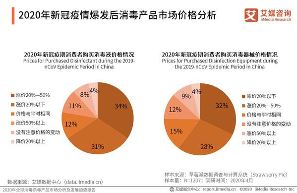 受2020年新冠疫情影响,消毒产品市场供求处于结构性紧缩状态,价格有所上涨。iiMedia Research(艾媒咨询)数据显示,新冠疫期消费者购买的消毒液中,34%的产品涨价20%-50%,31%的产品涨价20%以下,11%的产品涨价50%以上;消费者购买的消毒器械中,32%的产品涨价20%以下,28%的产品涨价20%-50%,9%的产品涨价50%以上。